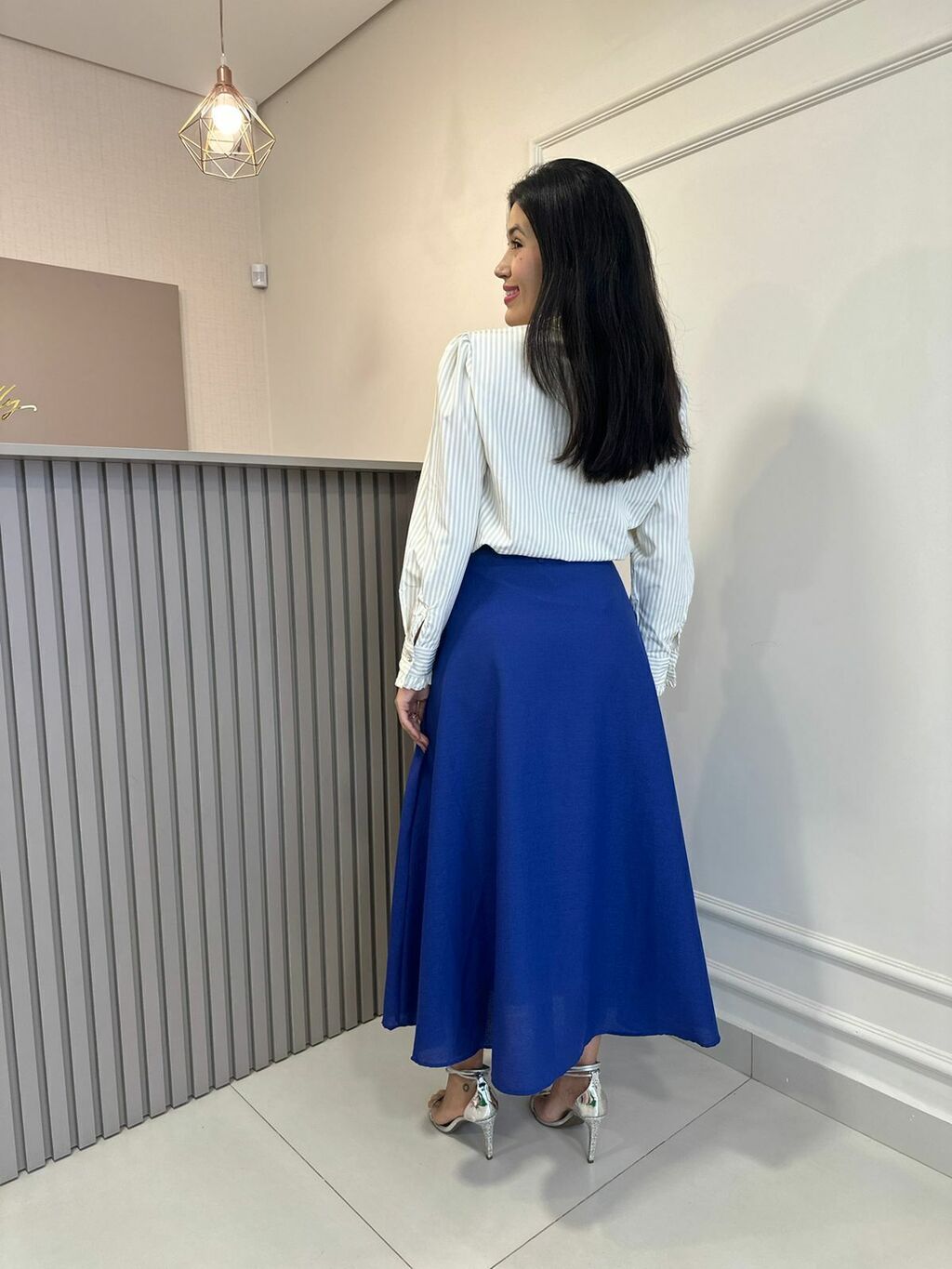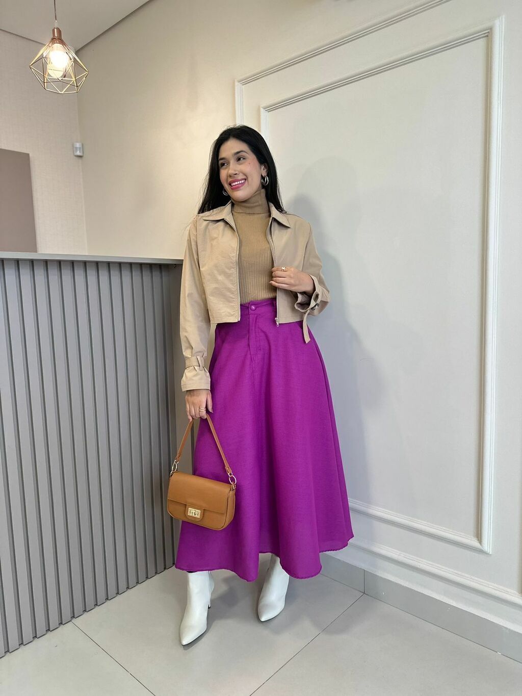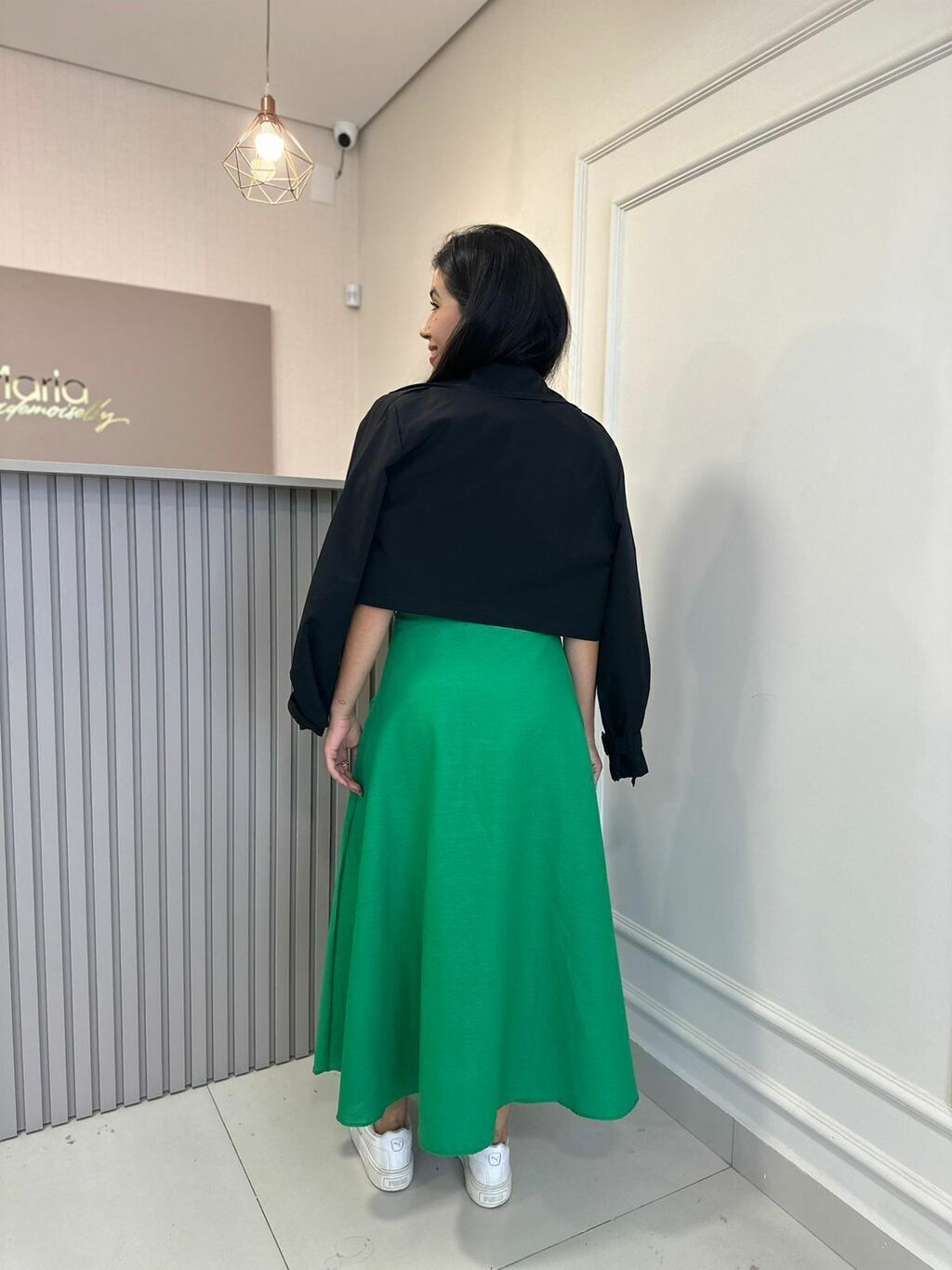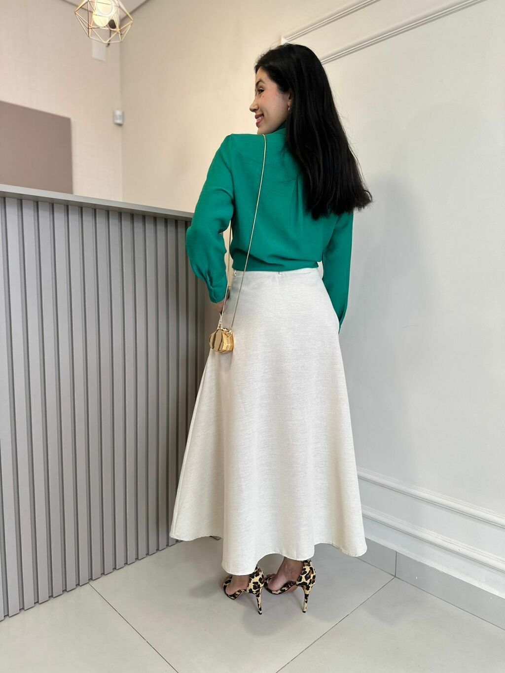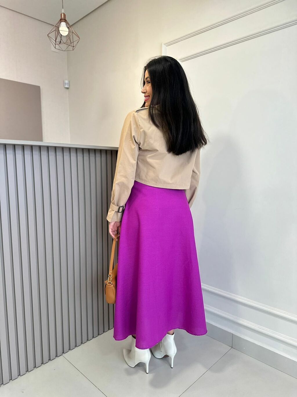 Prepare-se para se apaixonar por este modelo midi encantador. Com seu design bem rodado e cos alto, esta saia oferece um visual elegante e feminino. O fechamento em zíper e o bolso faca adicionam praticidade e estilo, enquanto o tecido de crepe de alfaiataria proporciona conforto e fluidez. Um item indispensável para seu guarda-roupa, com acabamento impecável e caimento perfeito.